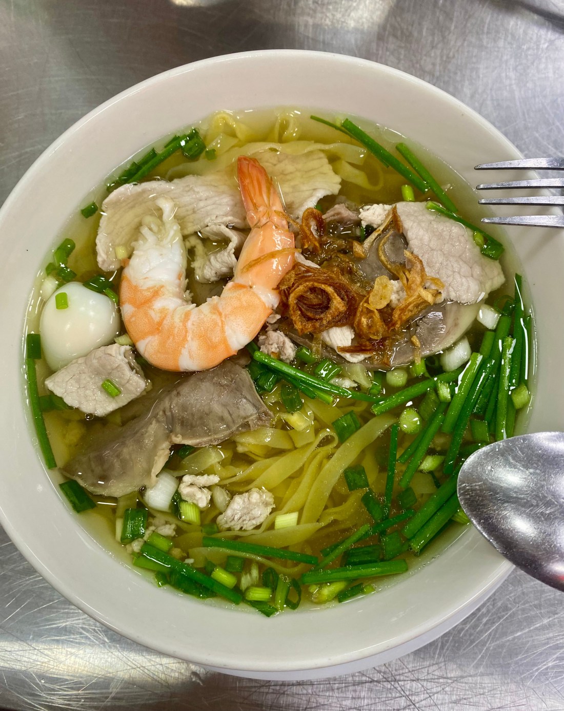 Mi Quang — традиционная центрально-вьетнамская лапша с желтыми рисовыми лентами, бульоном, креветками, мясом, зеленью и хрустящими рисовыми чипсами.